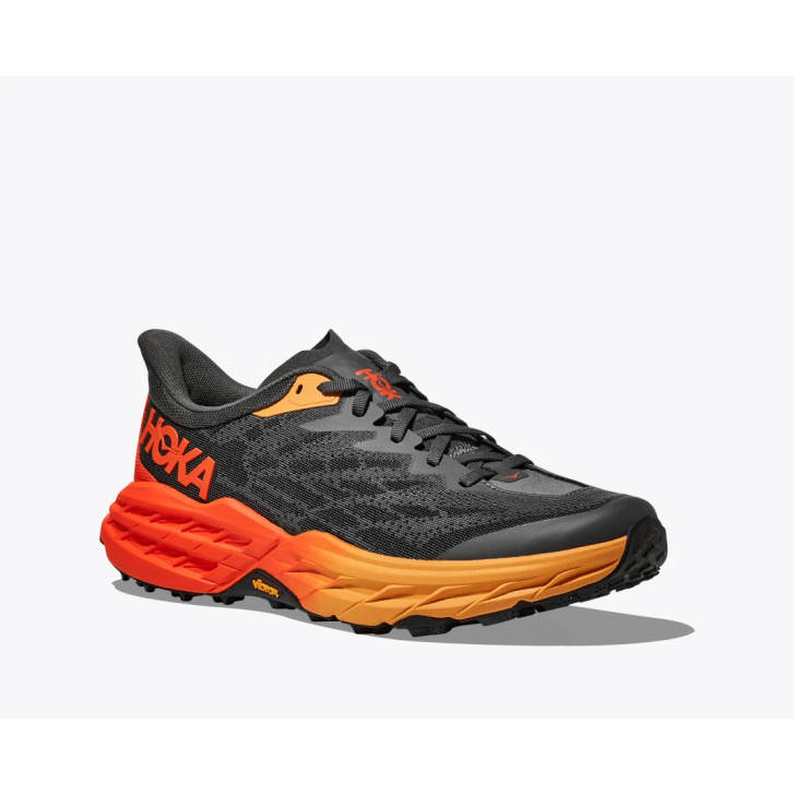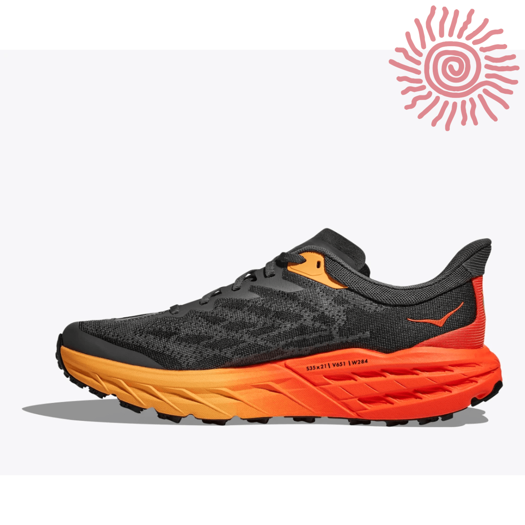 A workhorse designed for technical trails, the Speedgoat returns with less weight and more traction than ever before. A new shoe from outsole to laces, this trail beast is updated with Vibram® Megagrip with Traction Lug for enhanced grip on loose soil. Retaining the same stack height and rocker profile, the Speedgoat 5 employs a lighter midsole compound and heartier, double layer jacquard mesh to inspire confidence on any terrain.
